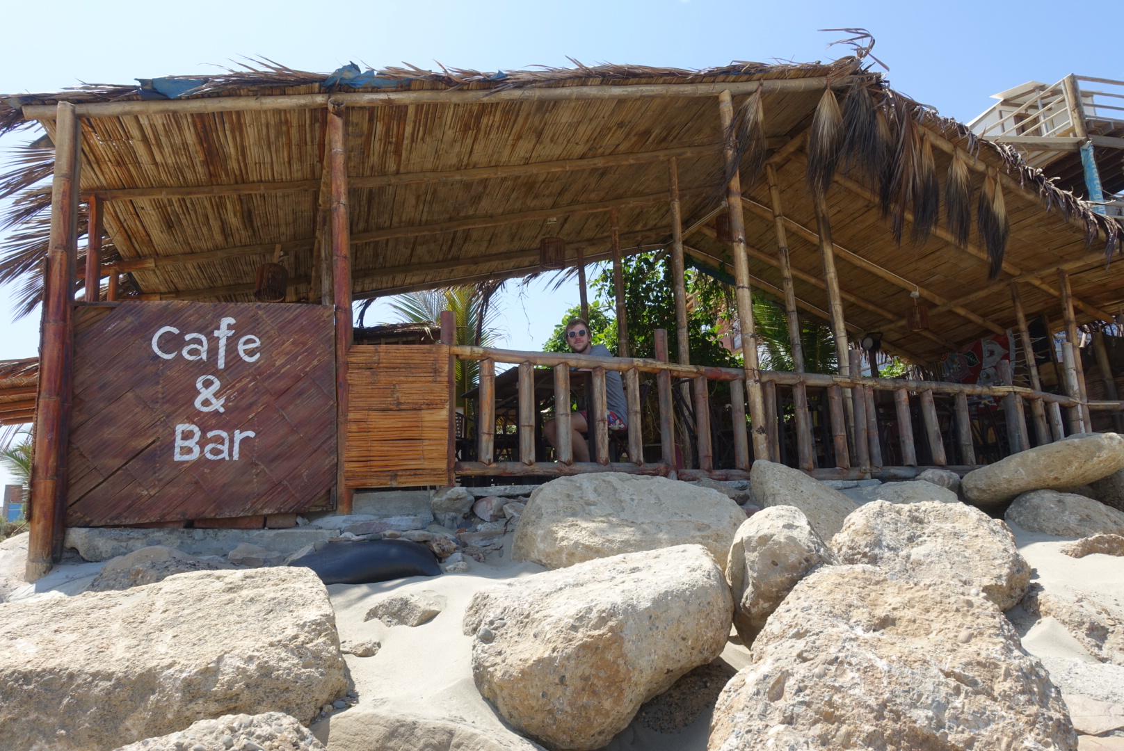 Par hasard, nous nous posons dans le premier café ouvert en bord de mer, une grande hutte tout en bambou et en bois. Nous commandons un petit déjeuner et discutons un peu avec le propriétaire du café, un expatrié australien. Il nous propose de prendre une chambre dans son auberge attenante au café. Nous acceptons et peu de temps après nous sommes sur le lit, à dormir… Jusqu’à 16 heures.