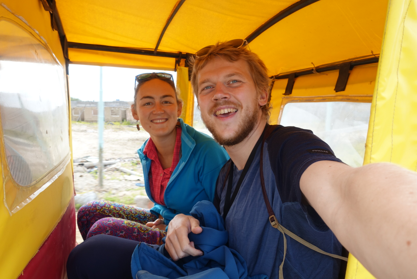 Nous débarquons dans cette petite ville, un oasis dans le désert, coincée entre des collines de sable ocre et la mer. Il est 5h45 du matin. Nous n’avons pas l’air frais, d’ailleurs nous ne sentons pas vraiment la fraîcheur non plus. Nous marchons jusqu’à la mer pour établir notre campement de fortune en attendant que quelque chose ouvre. Ce que nous ne nous figurons pas, c’est qu’elle est à 1km de là où nous a déposé le bus et que LE chemin n’est pas évident pour les non-initiés. Plusieurs fois, des personnes nous interpelle pour nous dire de faire demi-tour car nous entrons dans des quartiers pas sûrs. Nous avons l’air tellement perdus qu’à un moment un employé municipal décide de nous rediriger sur la bonne rue. Il insiste pour que nous empruntions le premier touk-touk venu (une sorte de moto dont l’arrière à été remplacé par une banquette deux-places couverte sur deux roues). Le bon monsieur étant sourd, nous n’arrivons pas à lui expliquer que nous venons de traverser la frontière et que nous n’avons pas une sol (monnaie locale 1€ = 3,7S environ). Le premier touk-touk que l’employé municipal arrête pour nous, lui, comprend vite que nous ne pourrons pas le payer et s’en va. L’employé municipal nous indique donc le bon chemin et nous continuons notre marche jusqu’à la plage, nos deux gros sacs sur le dos. Là, nous nous posons et attendons. Trois chiens errants cherchant nous tiennent compagnie. Avec nos têtes de defractés, nous devons vraiment passer pour des clochards. PJ refait un aller-retour vers le centre-ville pour retirer de l’argent tandis qu’Alizée garde les sacs.