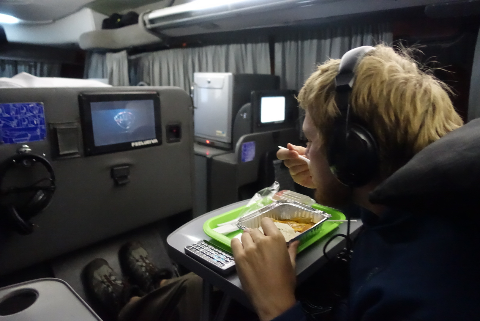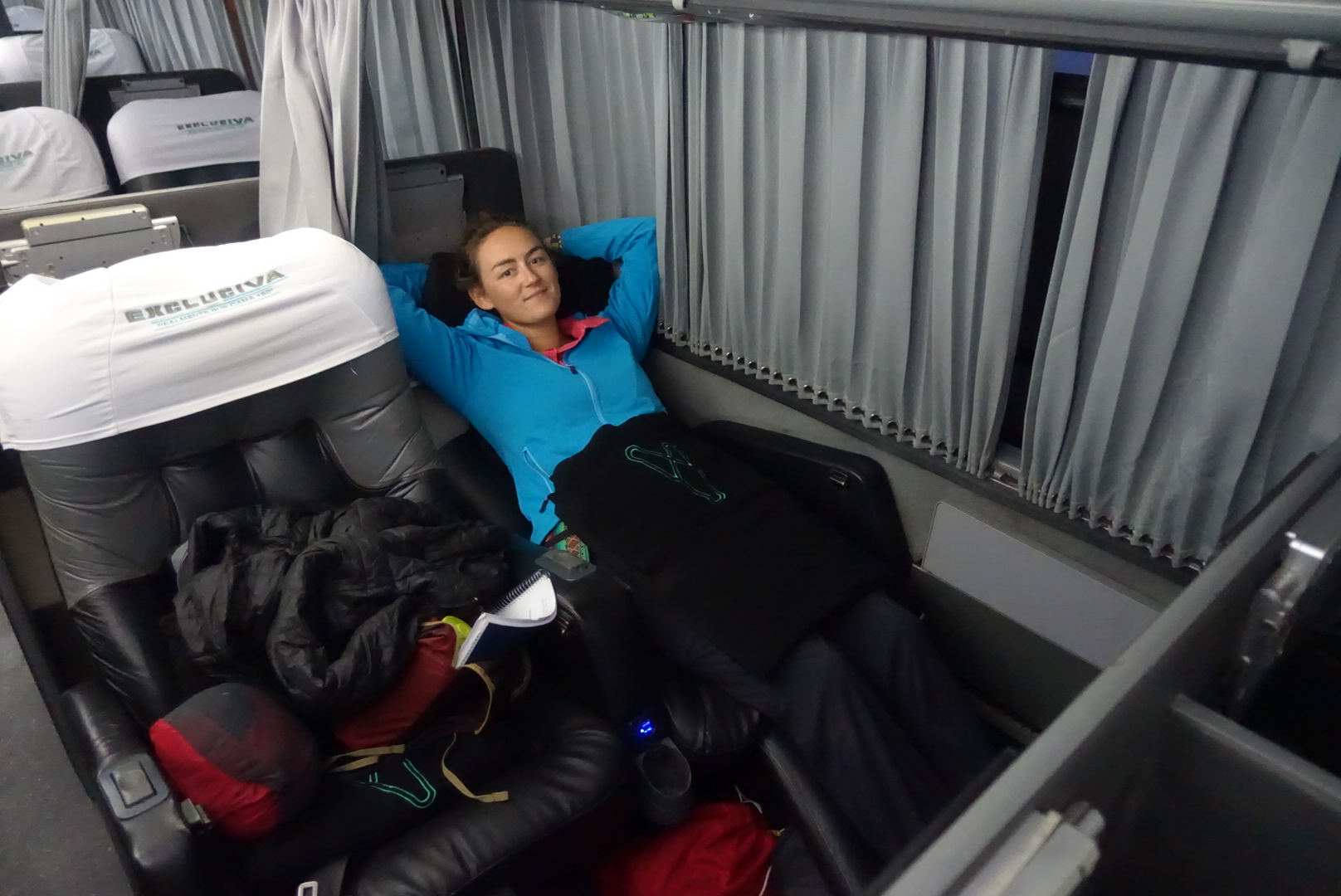 Le soir, nous prenons notre premier bus de nuit pour Chachapoyas. C’est le grand luxe, mieux qu’en avion. Les sièges sont entièrement inclinables, nous avons un coussin et une couverture, une petite télé perso et même des petits rideaux pour être bien tranquille.