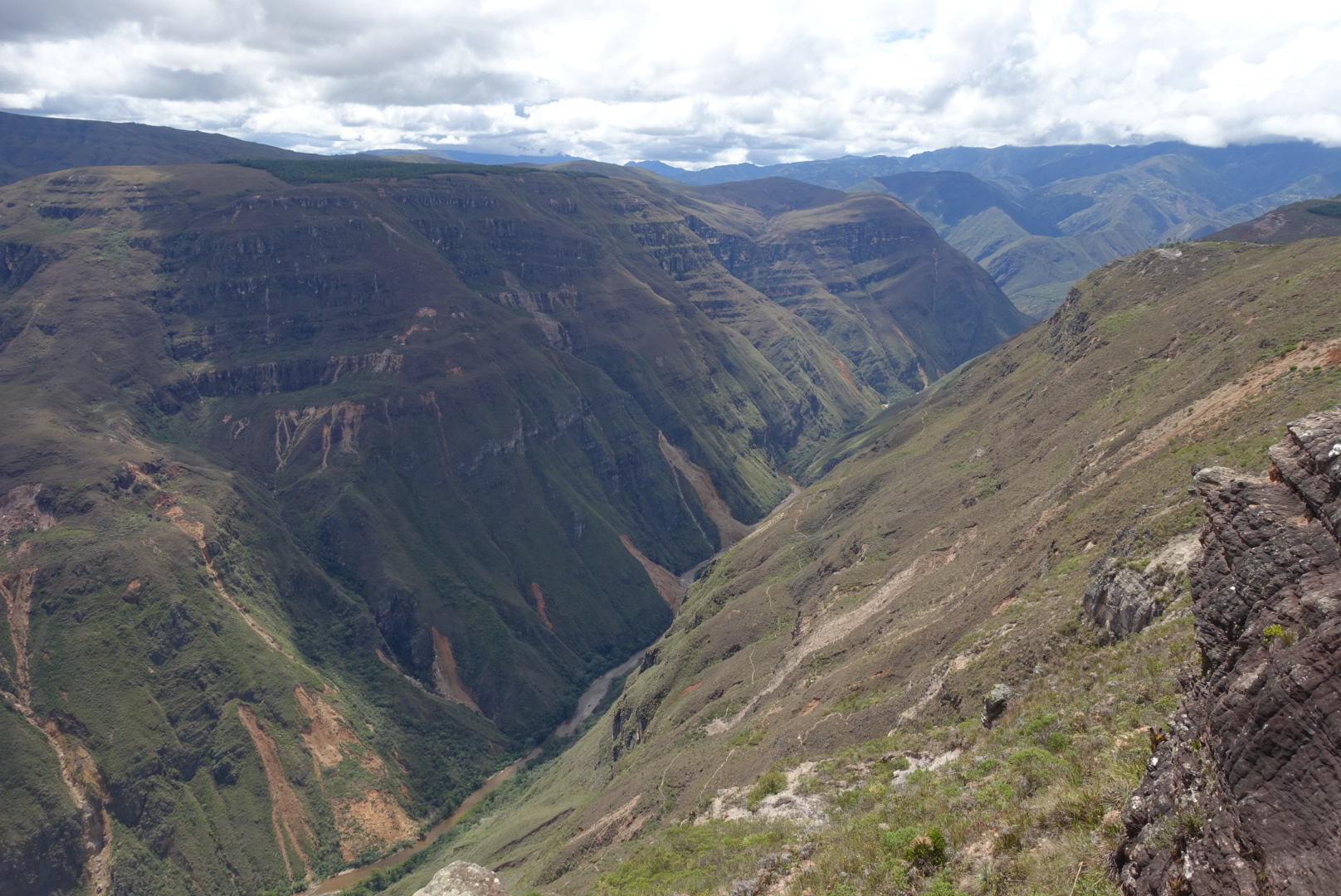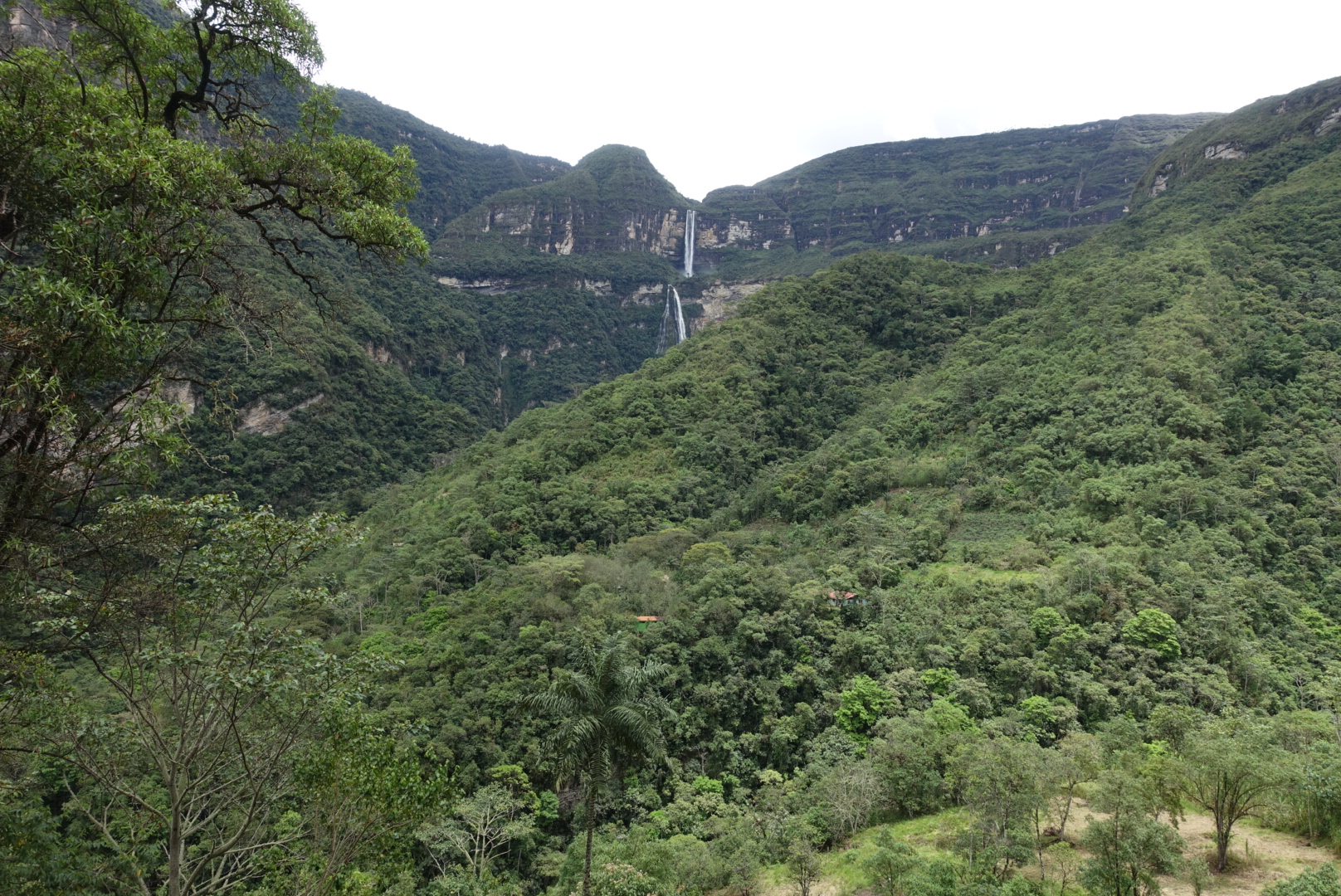 PJ va un peu mieux, nous partons ensemble voir le canyon de Huancas. On s’y rend depuis Chachapoyas en à peine 20 minutes de mini-bus collectif. Nous arrivons sur la place d’un tout petit village. De là, nous marchons 10 minutes pour atteindre une crête où s’offre à nous une vue époustouflante sur le canyon.