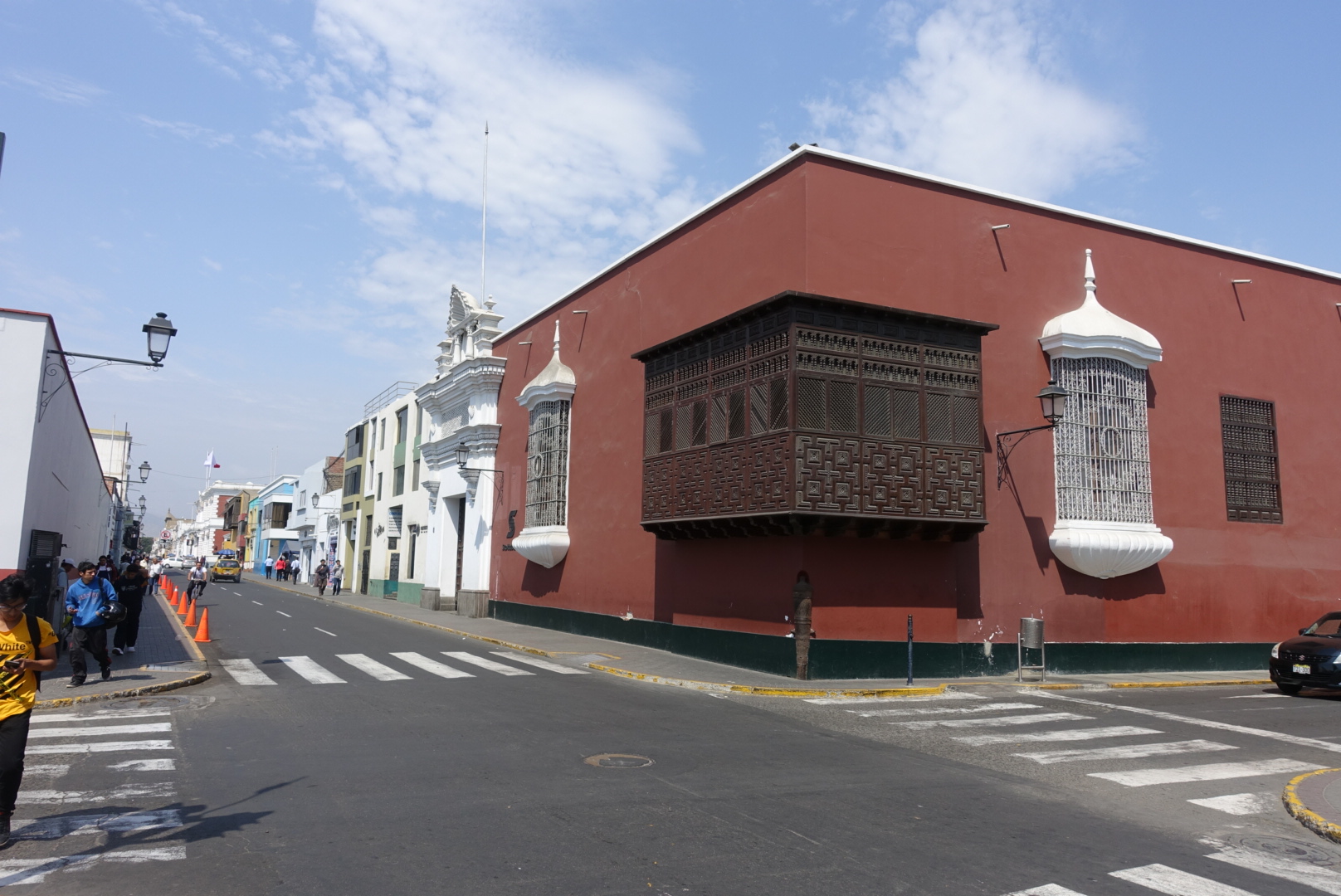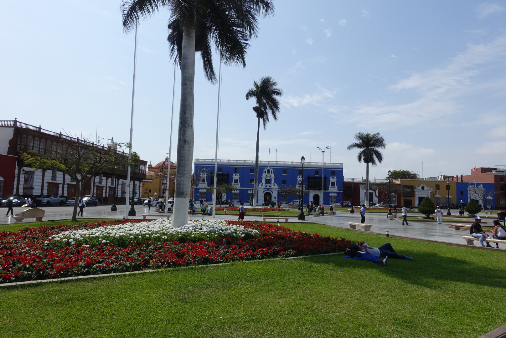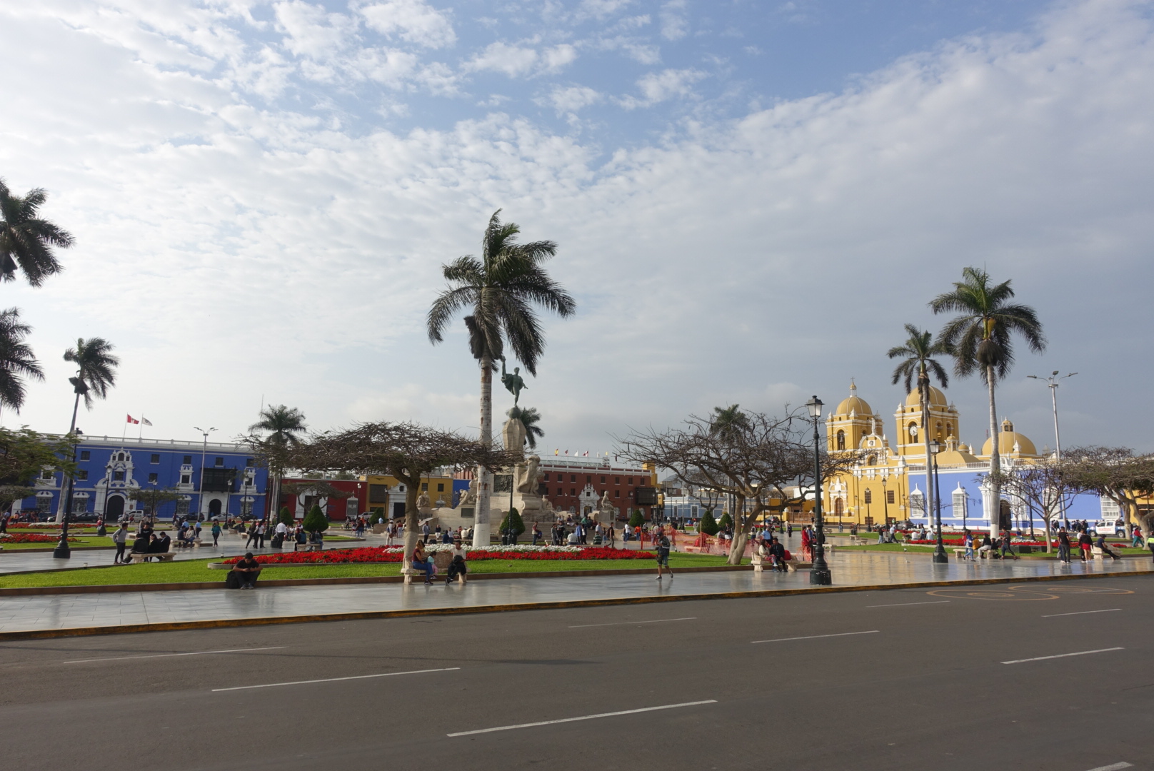 L’atmosphère de Trujillo est différente des autres villes péruviennes que nous avons vu jusqu’ici. La traditionnelle place d’armes est resplendissante et les bâtiments qui l’entoure sont dans un style colonial très coloré et bien conservé. Pendant notre balade, nous passons également par une grande rue piétonne (!!) avec des commerces « bien établis ». Pas de vendeur à la sauvette, pas de cuisine de rue.
