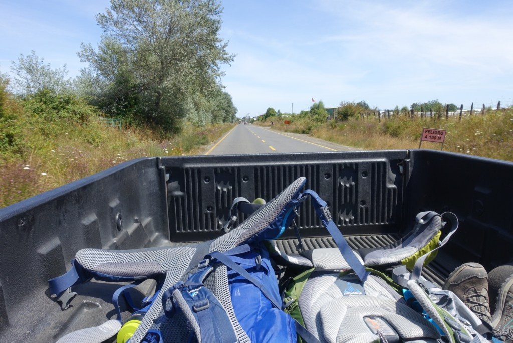 Il n’y a pas de bus qui va jusqu’au centre du parc. Nous faisons du stop. Il n’a pas fallu longtemps avant d’être pris par un premier pickup, puis un deuxième. À chaque fois, on saute dans le coffre à l’arrière avec nos deux sac. Dans le deuxième pick-up, on se retrouve même à 5 personnes à l’arrière avec les bagages. Un petit endroit bien cosy pour discuter pendant le trajet. On aime énormément le côté décontracté, simple et bien sympathique des sud américains.