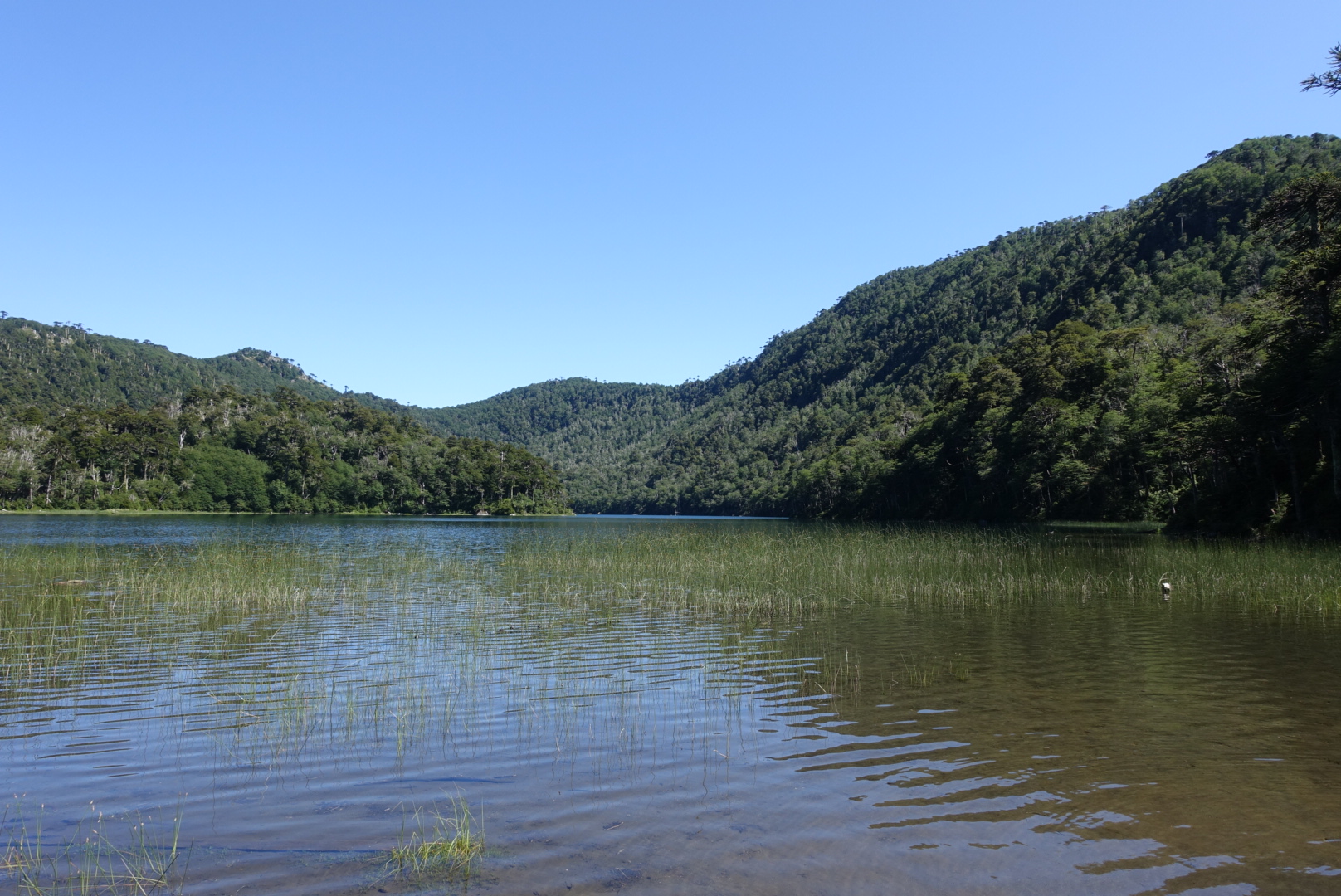 En fin d’après-midi, nous partons pour le parc Huerquehue. Nous montons la tente dans le camping à l’entrée du parc, à côté du lac Tinquilco.