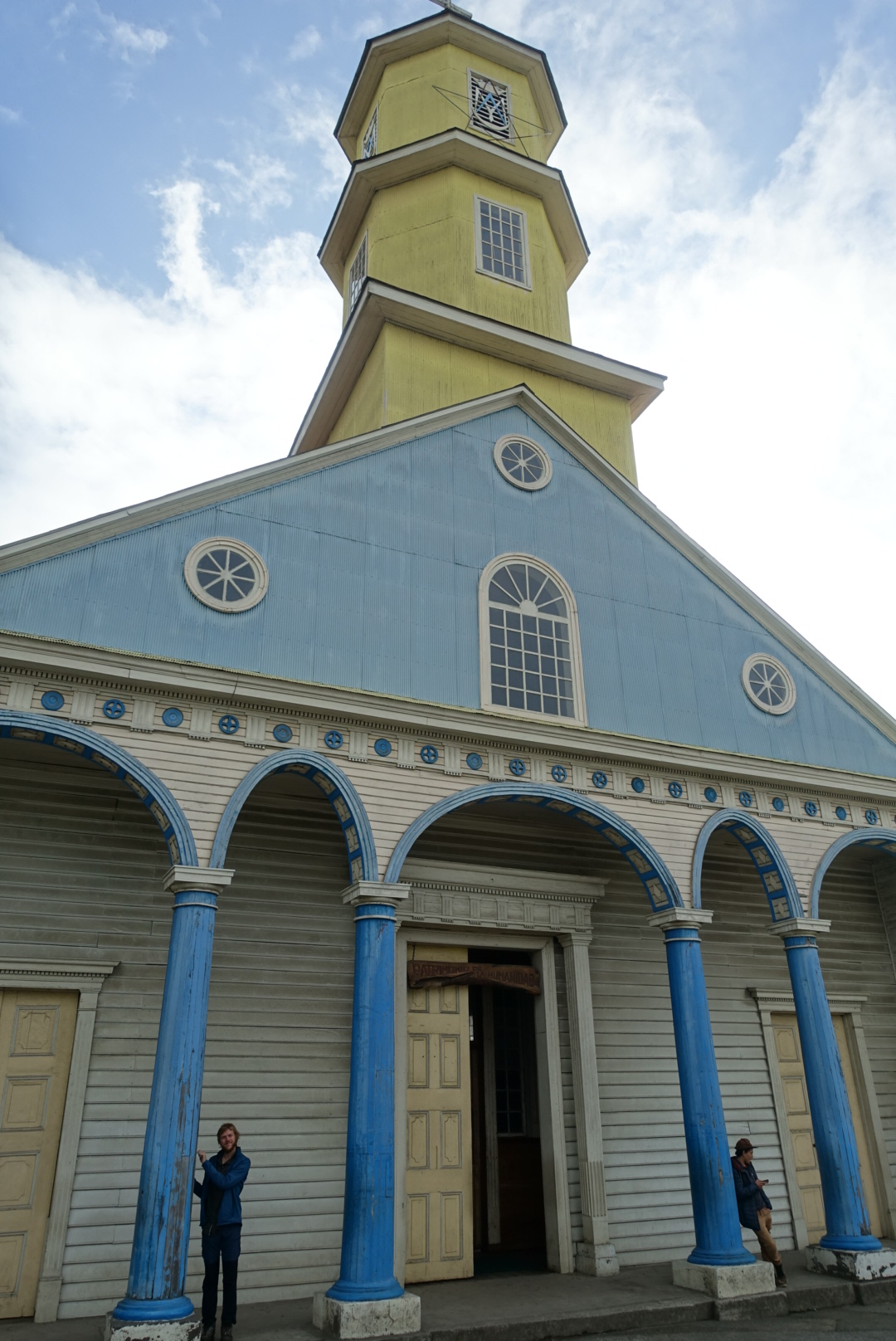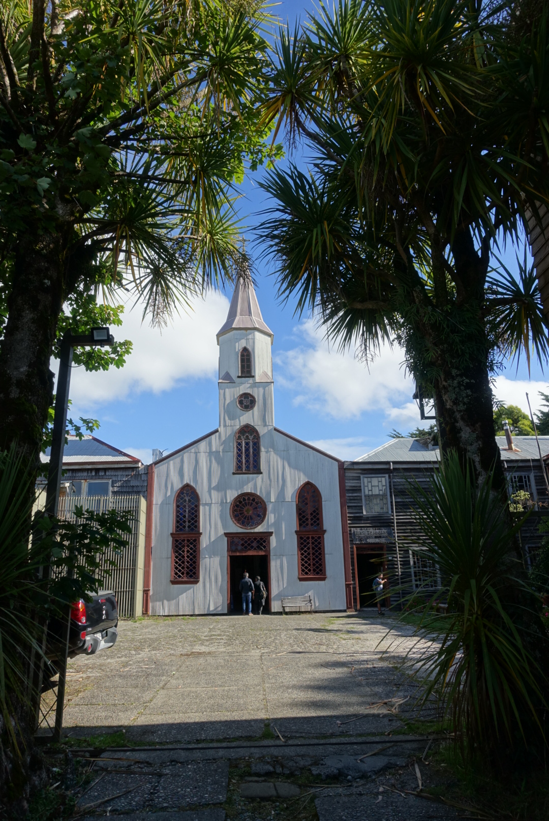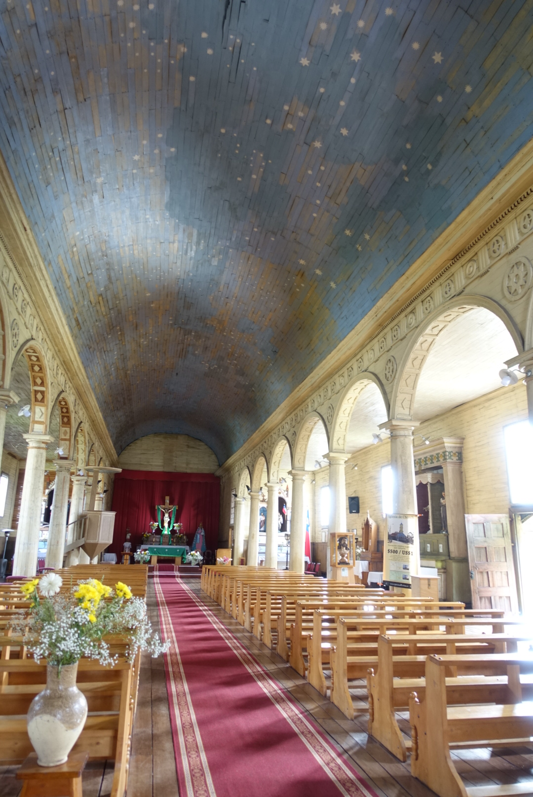 C’est au centre-ville d’Ancud que nous entrons dans notre première église chilote. En effet, l’île est connue pour ses églises en bois. Leur architecture unique est le résultat de siècles d’influence des missionnaires jésuites puis franciscains sur les populations indigènes locales convertis au christianisme (pour une fois, cela s’est fait pacifiquement). Lors des constructions de ces édifices religieux, les locaux ont utilisé leur exceptionnelle maîtrise du bois. Aujourd’hui, pas moins de 16 des 150 églises de l’archipel sont inscrites au patrimoine mondial de l’UNESCO.