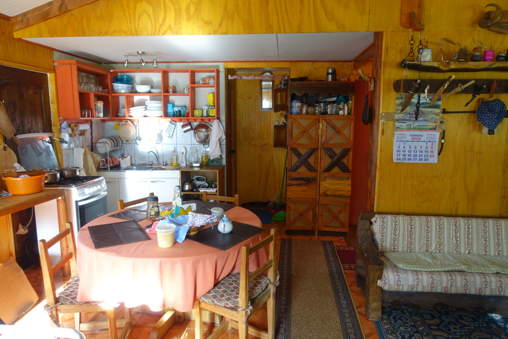 Dans le salon s’aligne une collection de pots à maté et de couteaux. Tout ici est de la récupération ou a été bricolé par Monsieur. Le poêle au centre du salon chauffe toute la maison, fait office de sèche-linge et sert à cuisiner.