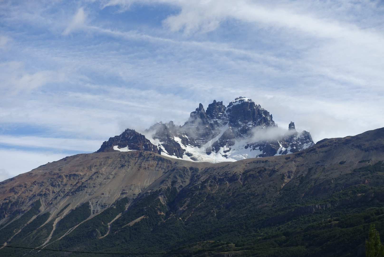 Nous trouvons deux sièges libres nous permettant de s’assoir les deux premières heures. Puis nous faisons halte à Villa Cerro Castillo. Ce petit village se trouve au pied du Cerro Castillo (quelle originalité), une très jolie montagne dont les pics alignés ressemblent à une forteresse. Fut un temps, nous envisagions de faire un trek de 5 jours, ou juste s’arrêter pour une journée de randonnée sur cette montagne. Mais faute de temps, nous avons préféré continuer directement jusque Puerto Río Tranquilo. Toutefois, cet arrêt nous permet de bien contempler les tours du Cerro Castillo depuis le village.