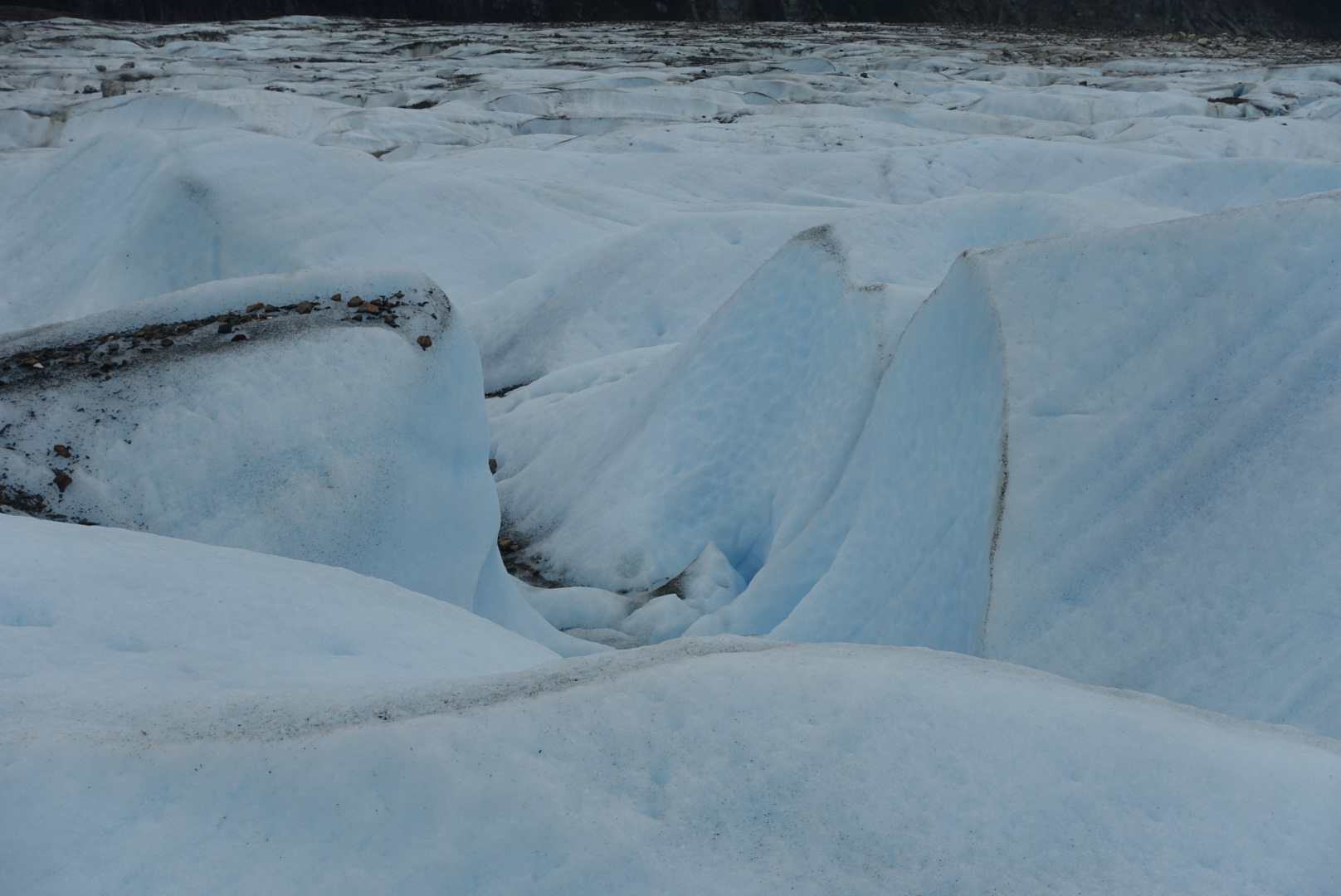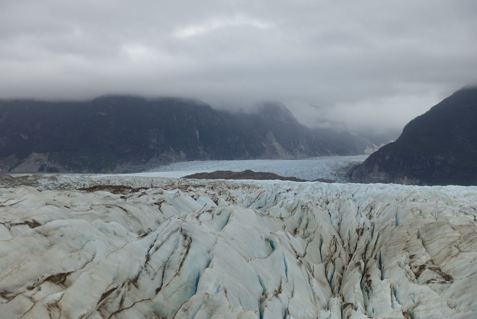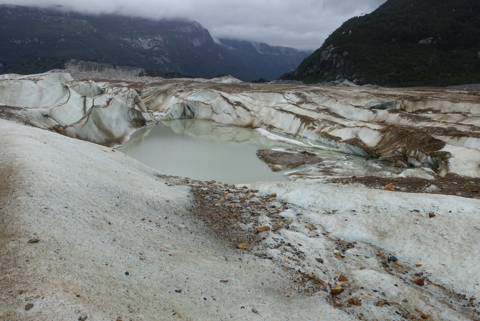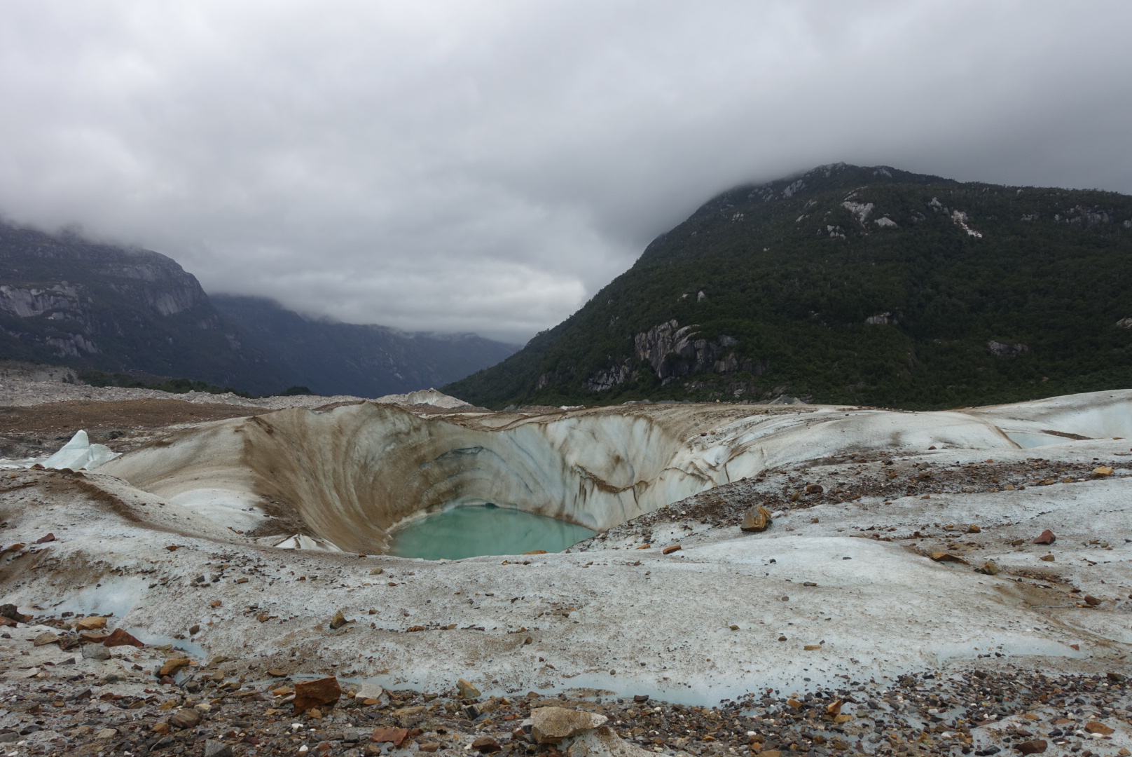 Nous partons au petit matin, direction le glacier « Los Exploradores ». Casques sur la tête et crampons dans le sac, nous nous engageons dans une de ces forêts « siempreverde » tempérées et touffues typiques de la région. Après trente minutes de marche nous arrivons de l’autre côté de la forêt, en haut d’une falaise de cailloux et de sable gris. Cette falaise s’est formée lors de la dernière période glaciaire par la poussée du glacier, avant que celui-ci ne fonde et se retire. D’ailleurs, nous distinguons clairement le glacier au loin.