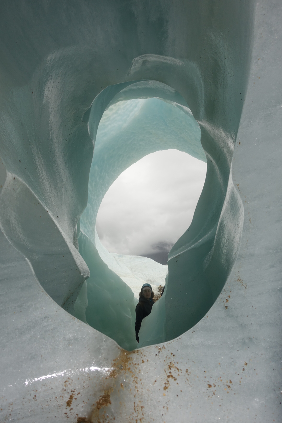 Dans les caves et les crevasses, la glace d’habitude blanche bleuit. Plus la glace est compacte et moins il y a d’air emprisonné à l’intérieur, ce qui lui donne cette couleur bleue. Nous nous efforçons donc de marcher sur les zones les plus bleues qui sont les plus solides.