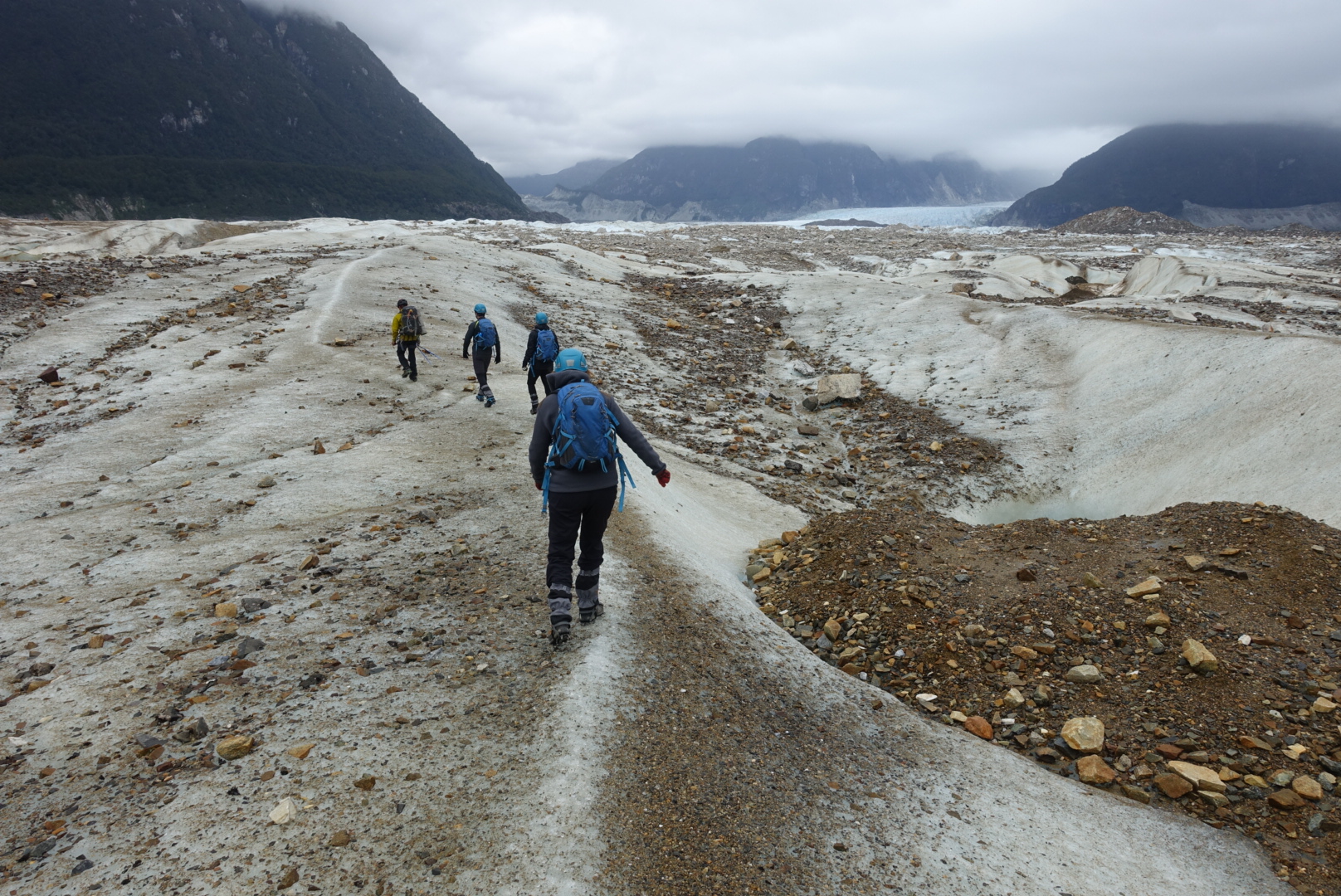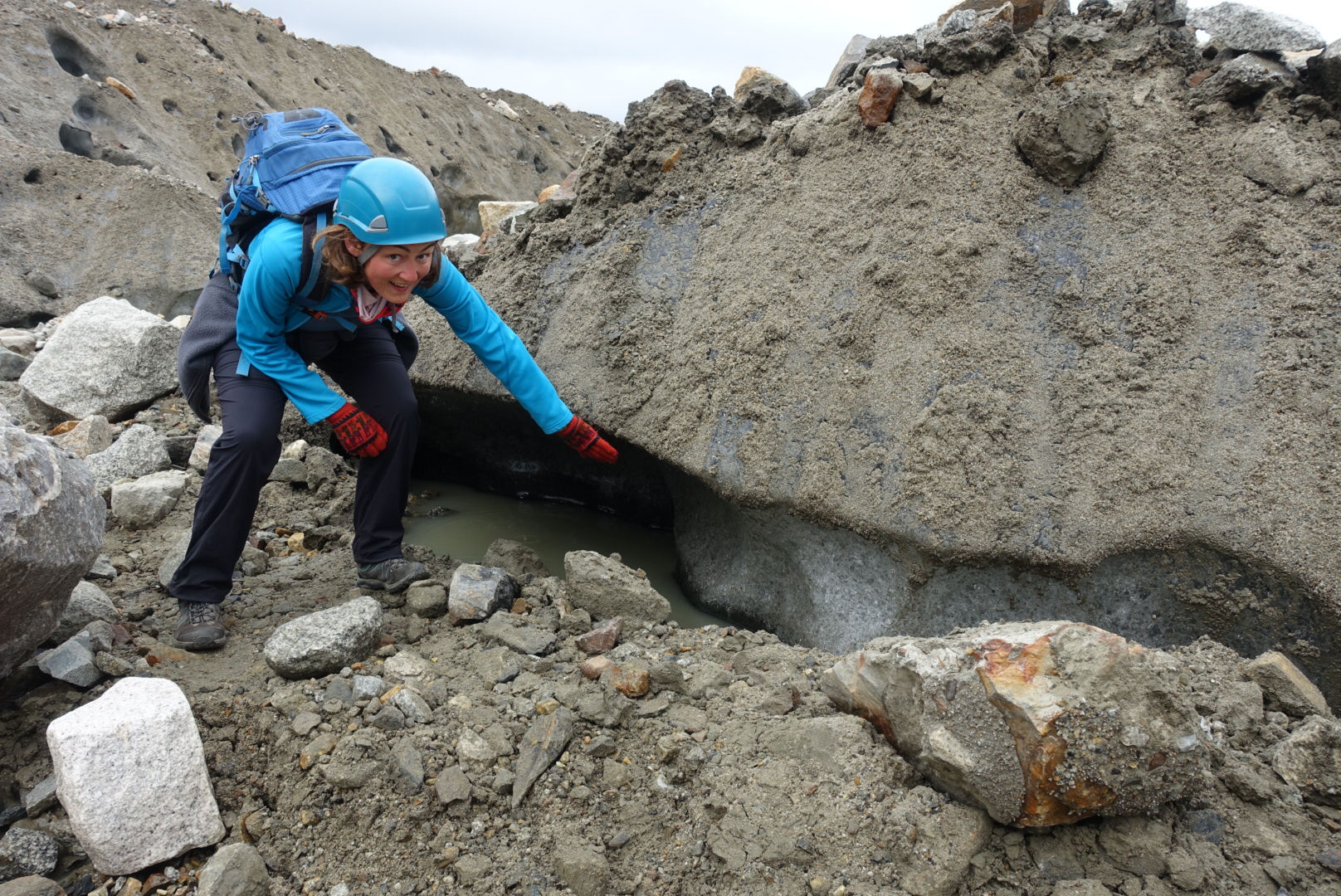 Nous descendons la dune de cailloux et arrivons à la limite du glacier où se mélangent les restes de glace et les roches déchirés par la coulée. Plus nous avançons et plus la glace se fait présente. Lorsqu’il n’est plus possible d’avancer sans marcher sur la glace, nous nous arrêtons pour chausser nos crampons.